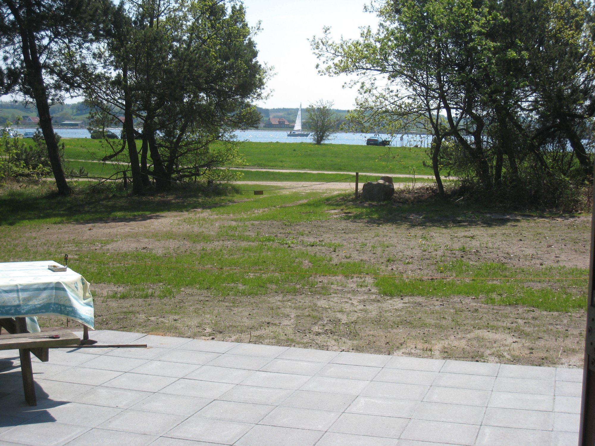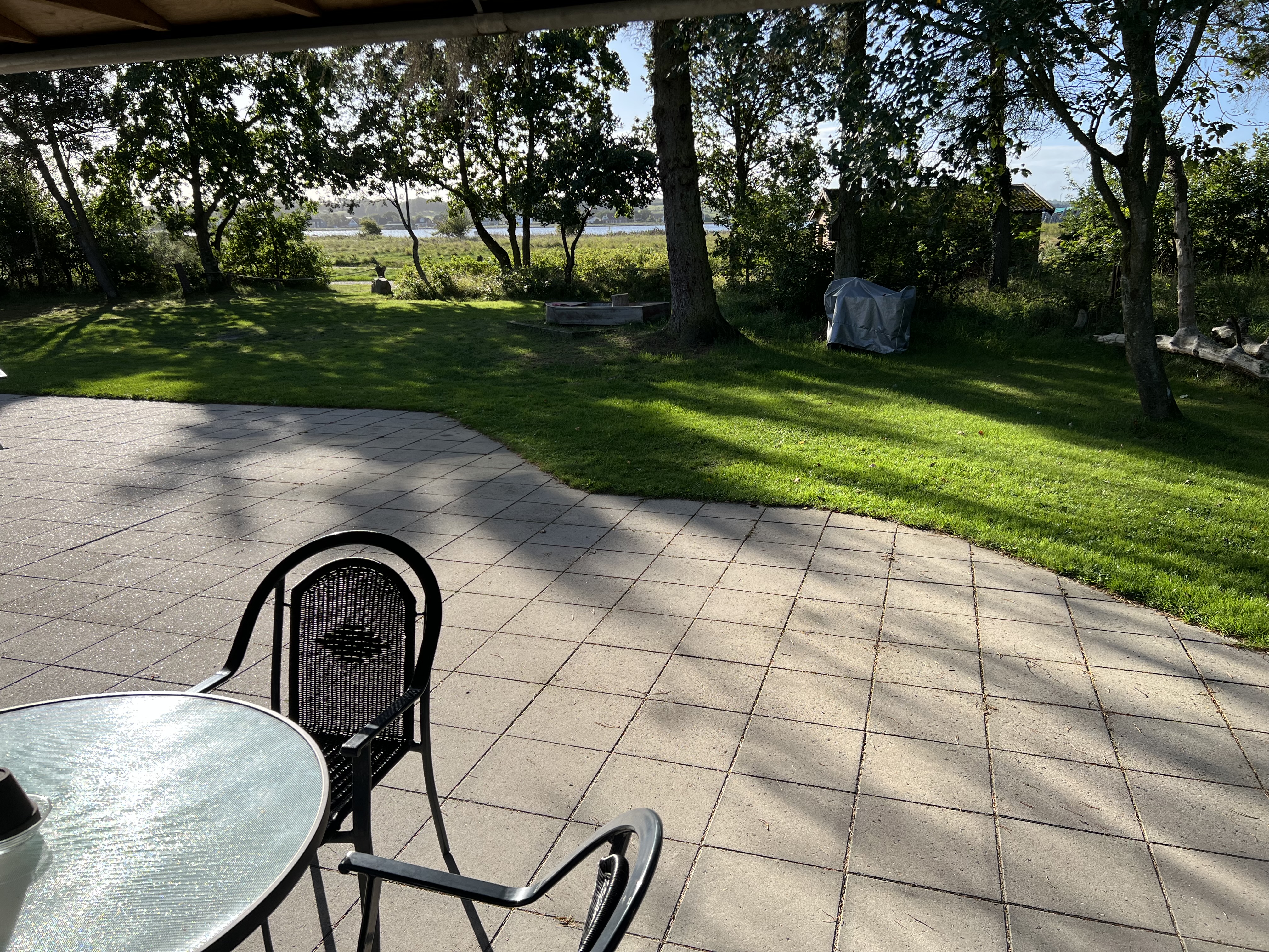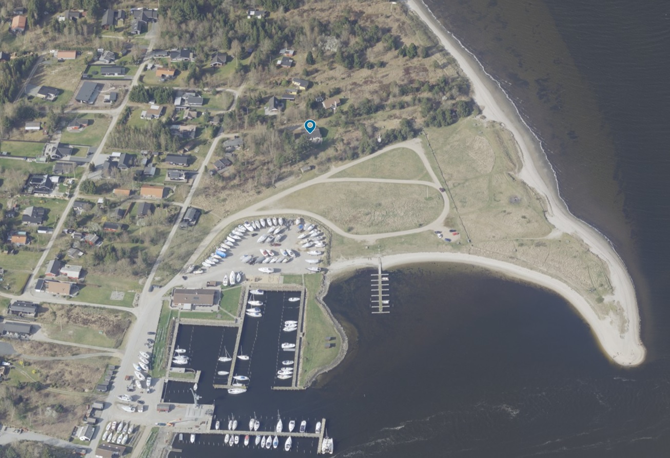 Stor sydvendt terrasse med udsigt til lystbådehavn og fjord. 4.000 m² naturgrund med direkte adgang til strand og bålplads.